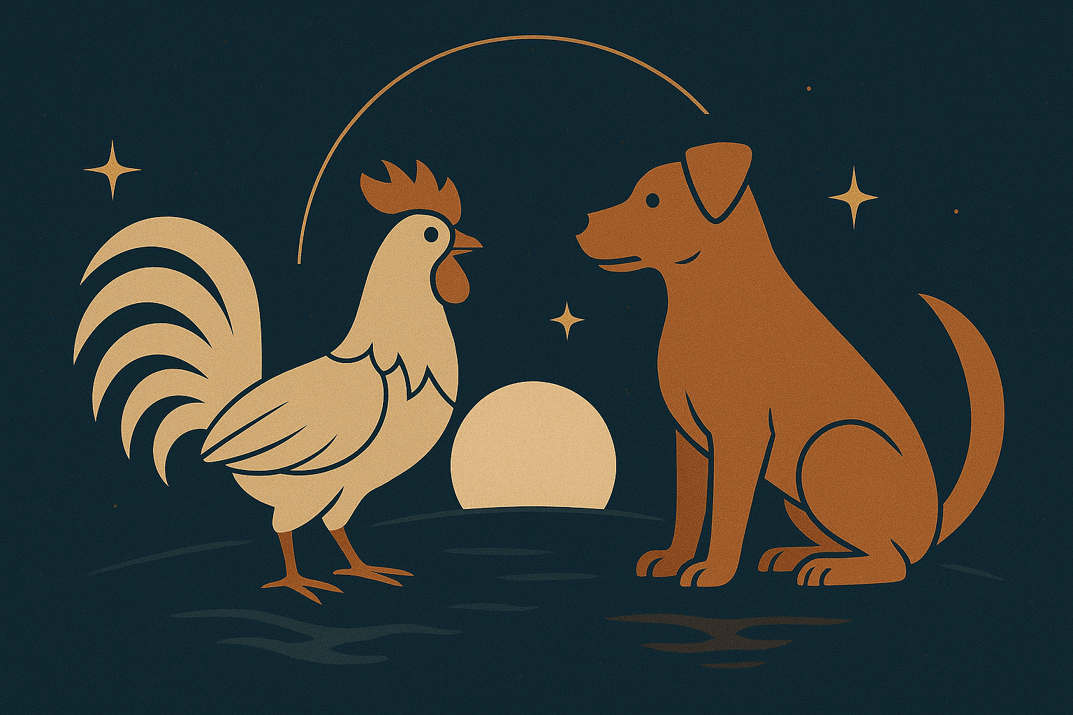 Le Coq, éclatant et organisé, avance avec fierté et souci du détail. Le Chien, calme et loyal, marche avec discrétion mais assurance. Leur relation est comme un sentier partagé entre la clarté de l’aube (Coq) et la profondeur du crépuscule (Chien). L’un inspire par sa vision, l’autre rassure par sa fidélité. Mais cette alliance n’est pas sans heurts : si chacun campe sur ses certitudes, le lien se tend. Le secret de leur harmonie ? L’écoute, l’humilité et la reconnaissance mutuelle des talents de l’autre.