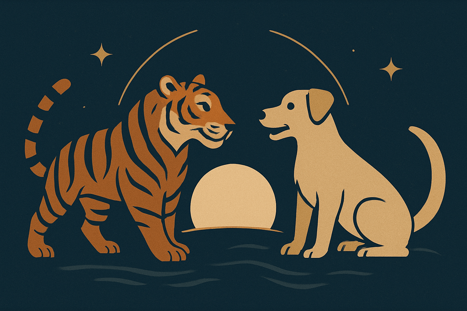 Le Tigre, libre et fougueux, rencontre le Chien, loyal et réfléchi. Ensemble, ils créent un équilibre rare entre passion et stabilité. Ce duo est porté par des valeurs communes : justice, honnêteté, authenticité. Mais ils avancent à des rythmes différents. Le Tigre veut bondir, explorer, innover. Le Chien préfère analyser, protéger, sécuriser. Cette différence, loin d’être un frein, devient leur force, à condition qu’ils l’honorent comme une complémentarité.